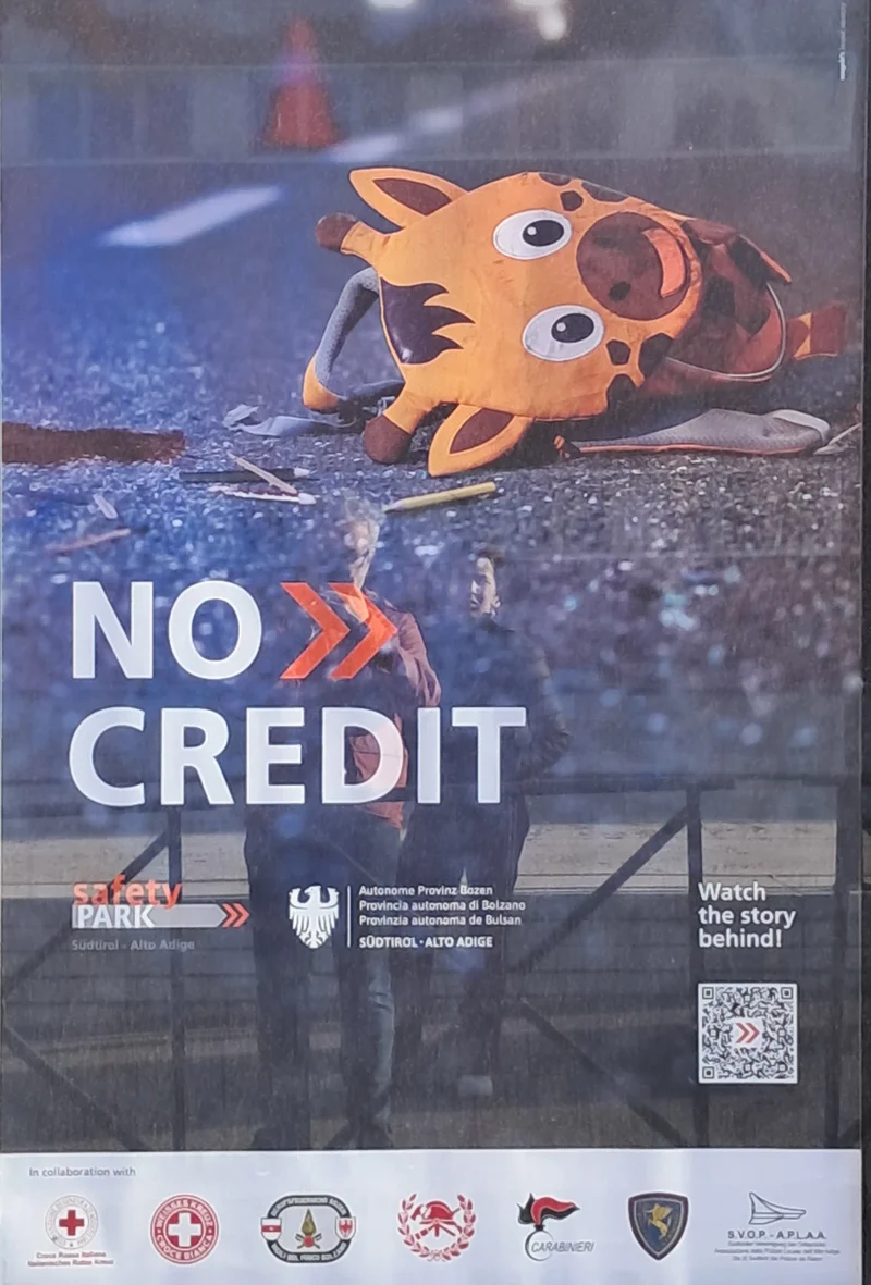 Die Kampagne "No Credit" wird vom Land Südtirol seit 2006 umgesetzt und soll Verkehrsteilnehmende zu sicherem und verantwortungsbewusstem Verhalten anregen. Sie basiert auf Bewusstseinsbildung, Kontrollen und baulichen Maßnahmen wie verbesserter Beschilderung, Instandhaltung der Straßen und zusätzlichen Schutzeinrichtungen an gefährlichen Stellen. Ein besonderer Schwerpunkt liegt je nach Jahr auf unterschiedlichen Themen. Im Jahr 2026 stehen die Erfahrungen von Rettungs- und Sicherheitskräften im Mittelpunkt der Kampagne.