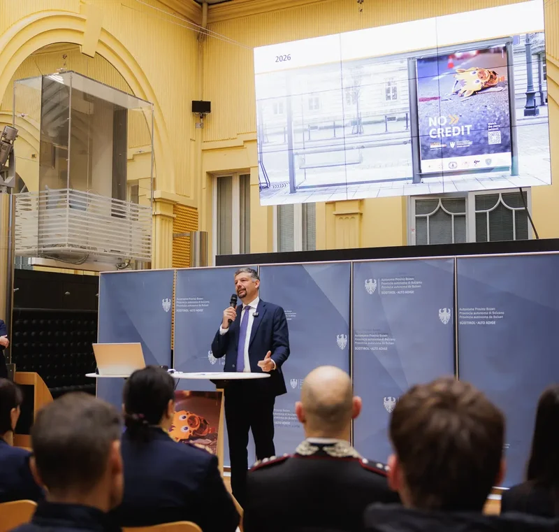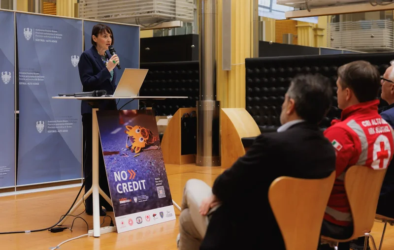 BOZEN (LPA). Die Verkehrssicherheitskampagne "No Credit 2026" des Landes Südtirol stellt erstmals reale Einsatzerfahrungen von Rettungs- und Sicherheitskräften in den Mittelpunkt. Beteiligt sind unter anderem das Italienische Rote Kreuz, der Landesrettungsverein Weißes Kreuz, der Landesverband der Freiwilligen Feuerwehren Südtirols, die Berufsfeuerwehr, Carabinieri, Verkehrspolizei und Ortspolizei. Vorgestellt wurde die Initiative am 13. April im Palais Widmann in Bozen.