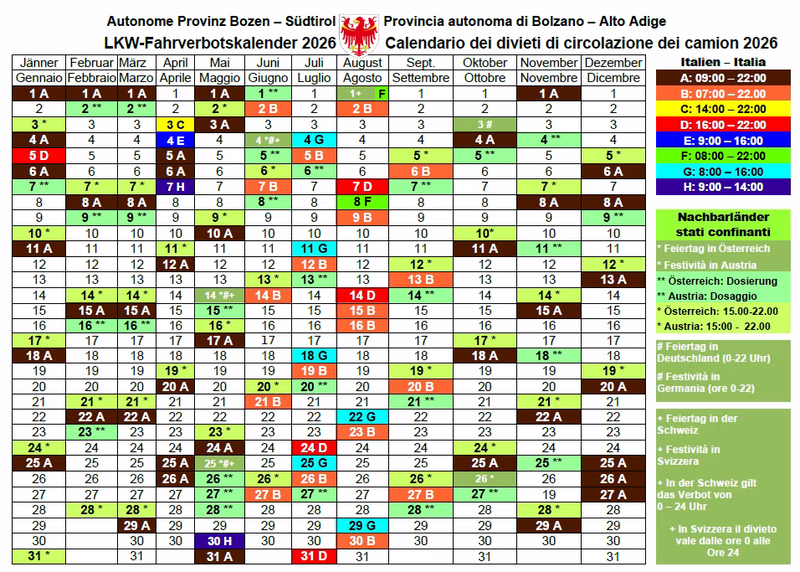 Zum Schutz des Personenverkehrs gelten in Italien und im benachbarten Ausland zeitliche Fahrverbote an verkehrsreichen Tagen.